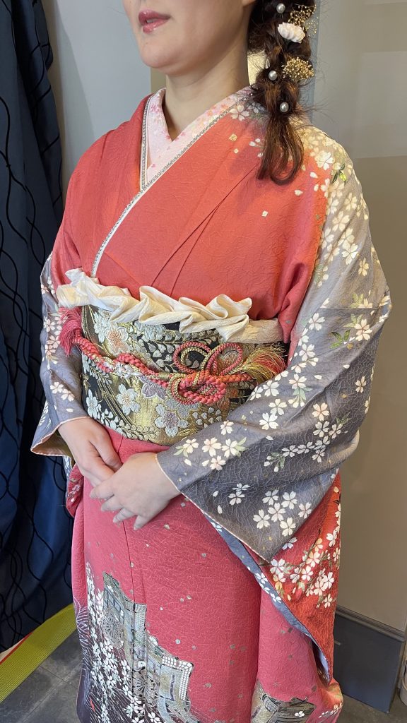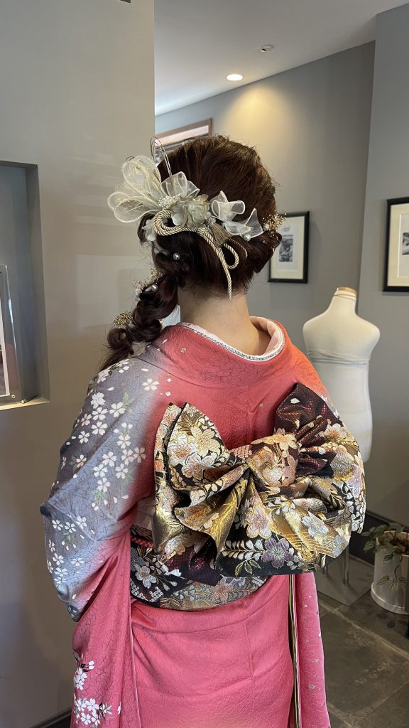 優しいコーラルピンクにグレーの組み合わせは私の好きな色合わせです。Rちゃんもヘアスタイルはこうしたい!とサイド編み込みはご希望で合わせられた髪飾りのリボンが本当に可愛かったです。帯もいろいろお見せした中でリボンが良いとのことでしたので、思い切り可愛く仕上げさせていただきました。キラキラの重ね襟だけでも華やかですが、スタッフの廣田さんおすすめの今年流行りのフリルでより華やかに仕上がりました♪めちゃくちゃ可愛いかったです(^^)